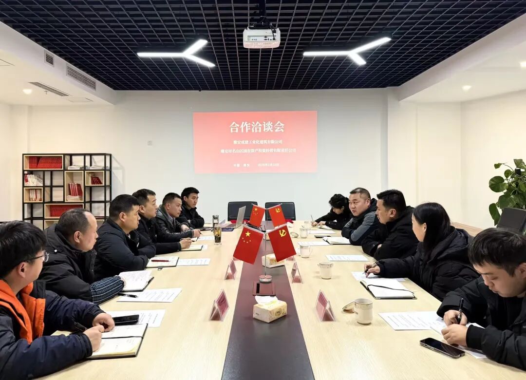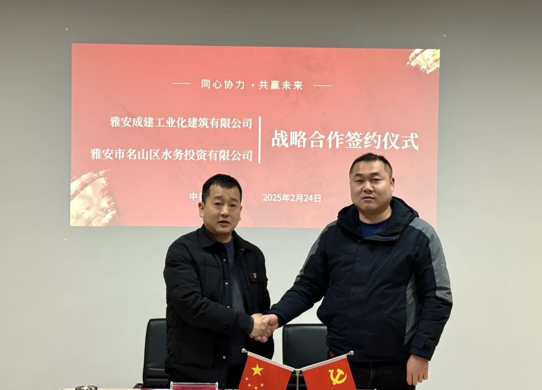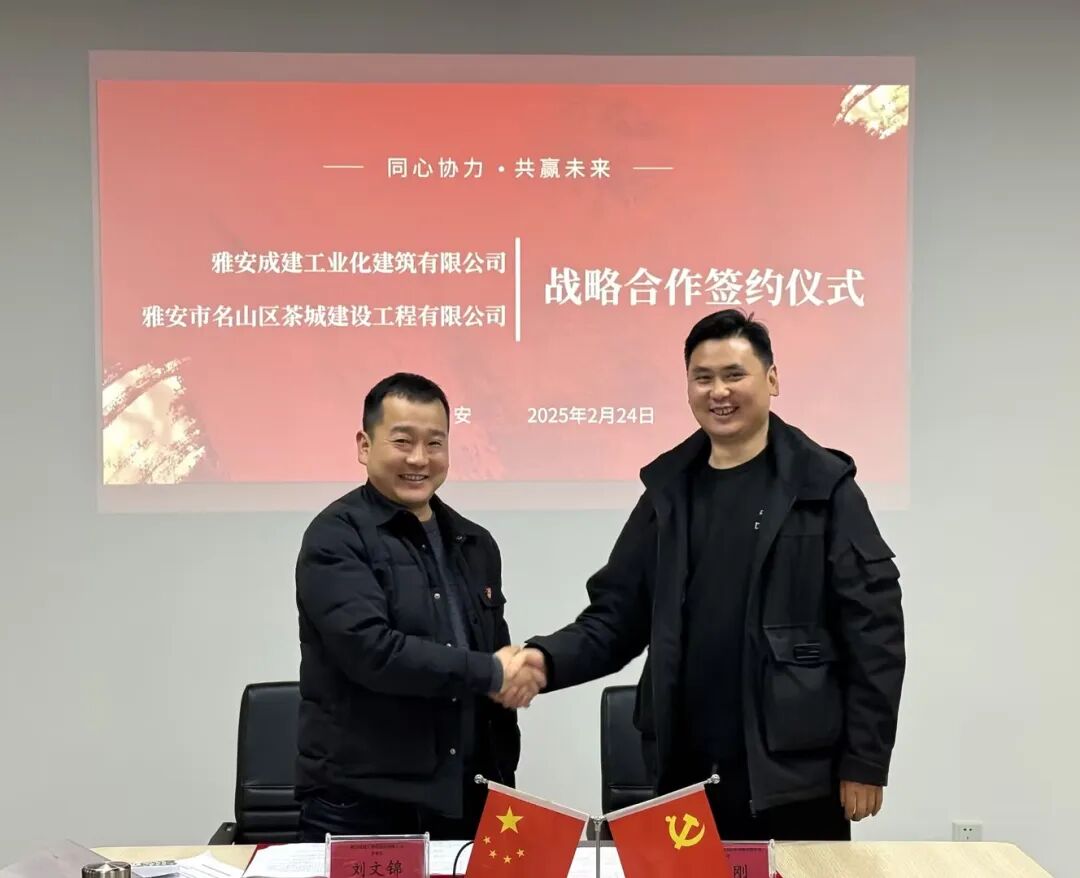 2025年2月24日,成建工業化公司與雅安市名山區國有資產投資經營有限責任公司(以下簡稱“名山國投”)、雅安市名山區茶城建設工程有限公司(以下簡稱“茶城公司”)、雅安市名山區水務投資有限公司(以下簡稱“名山水投”)進行了商務洽談會議,同時舉行了戰略合作簽約儀式。成建工業化公司董事長劉文錦,名山國投副總經理兼茶城公司分管領導陳剛,名山國投副總經理、名山水投董事長兼總經理鄭浩出席并講話,成建工業化公司總經理周勇、總工程師殷鴻翔、財務總監呂成富, 雅安市蒙頂山茗惠商貿有限公司副總經理高紅等雙方相關負責人參加會議和簽約儀式。